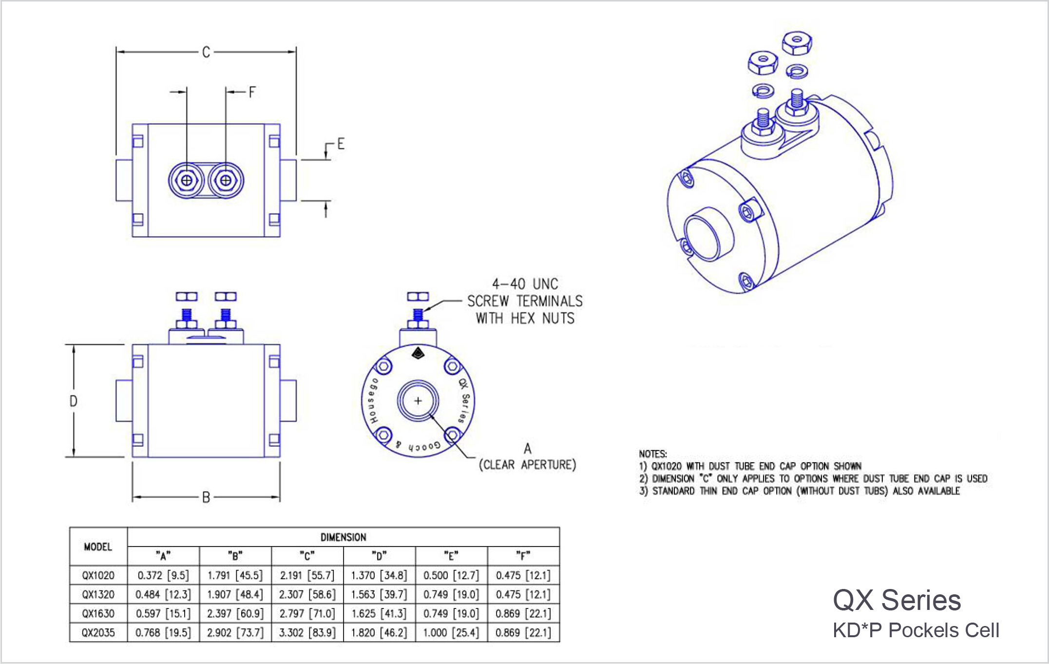 QX系列KD*P普克爾盒在300–1100nm波長(zhǎng)范圍內(nèi)工作,有效孔徑為9.5–19.5mm,重復(fù)頻率高達(dá)3kHz。在1064nm處提供大于2000:1的電壓對(duì)比度。QX系列為KD*P普克爾盒設(shè)定了標(biāo)準(zhǔn),采用寬帶、高損傷閾值溶膠凝膠增透膜及緊湊型設(shè)計(jì),以提高耐用性和性能,具有堅(jiān)固的陶瓷孔徑和優(yōu)質(zhì)的紫外級(jí)熔融石英窗口,可實(shí)現(xiàn)高透射率和對(duì)比度。