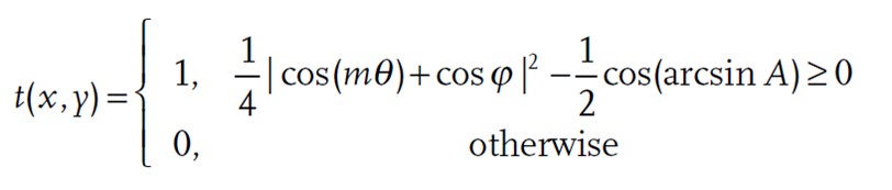 t(x, y) 的值從0到1之間連續(xù)變化,這樣的全息圖可以通過將連續(xù)值離散為多個級來實驗實現(xiàn),從而產(chǎn)生多級振幅元素。盡管它能很好地再現(xiàn)所需的球面波,但多層掩模的制造是具有挑戰(zhàn)性的,因為需要精確控制具有不同透射率的多個掩模的灰度。為解決這一難題,我們尋找一種編碼技術(shù)來獲得僅二進(jìn)制振幅的全息圖。我們根據(jù)與振幅相關(guān)的閾值截斷傳輸函數(shù) t(x, y),然后,我們將小于和大于閾值的t(x,y)的值分別設(shè)置為0和1。以這種方式,僅二進(jìn)制振幅的全息圖可以表示為