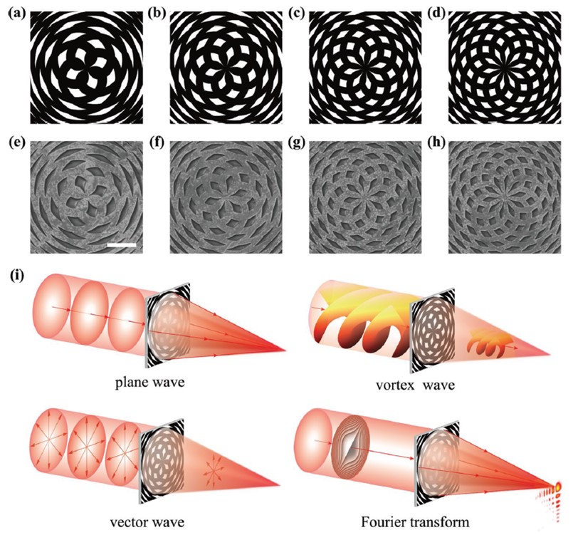 圖 1. 全局設(shè)計的平面透鏡及其在空間結(jié)構(gòu)光場聚焦和處理方面的潛力。其基本思想是利用角余弦波載波,將光的整體球面波陣面編碼為二進(jìn)制純振幅全息圖。(a-d)為平面透鏡的理論布局,(e-h)為相應(yīng)的實驗布局,典型的拓?fù)潆姾蔀椋海╝,e)m = 4;(b,f)m = 6;(c,g)m = 8;(d,h)m = 10. i),當(dāng)空間結(jié)構(gòu)光束(如渦旋光束和矢量光束)照射時,設(shè)計的平面透鏡有望實現(xiàn)多重聚焦性能。此外,還能實現(xiàn)更多的功能,例如對非衍射和自加速艾里光束進(jìn)行傅里葉變換。(a-h)中的面板比例相同,比例尺為10μm。