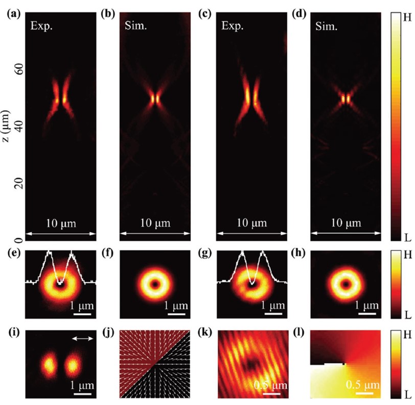 圖 3. 平面透鏡在空間結(jié)構(gòu)光光源下的亞波長聚焦性能。我們考慮了兩種結(jié)構(gòu)光束,即徑向偏振矢量光束和渦流光束。如圖2所示,使用相同的平面透鏡(m=8)對聚焦性能進(jìn)行了檢驗。(a-d) 在(a,b)矢量光束和(c,d)渦流光束情況下,沿 x - z 平面測量和模擬的衍射光場強(qiáng)度分布。(e,g)為實驗結(jié)果;(f,h)為模擬結(jié)果。為了研究焦平面的光狀態(tài),(i) 和 (k) 分別顯示了實驗矢量場的 x 分量和渦旋場的平面波干涉條紋;(j) 和 (l) 則分別顯示了矢量光束和渦旋光束在焦平面的偏振和相位分布。