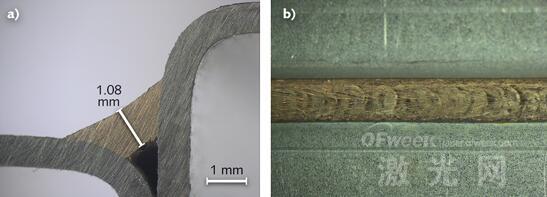 圖2:使用光束整形鏡組,將光束分成多個光斑,從而使釬焊熱鍍鋅材料成為可能(a),并且利用機器人獲得了4.5m/s的釬焊速度和令人滿意的加工質(zhì)量,包括完全沒有飛濺和氣孔的光滑材料表面(b)。