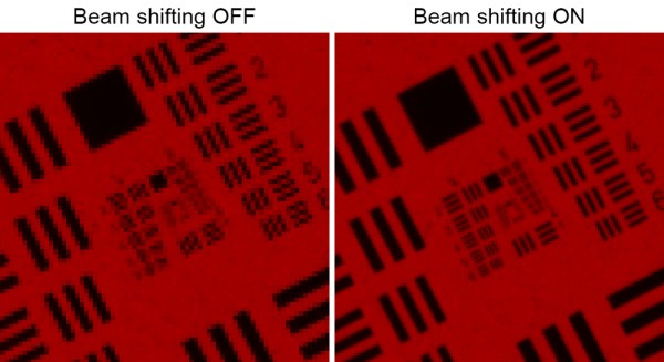 分辨率從 65 lp/mm(USAF 組 3 元件 4)增加到 130 lp/mm(USAF 組 4 元件 4),接近此相機(jī)(IMX265)的奈奎斯特極限 145 lp/mm,從而可以在所有三個顏色通道上實現(xiàn)全分辨率。